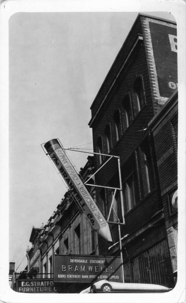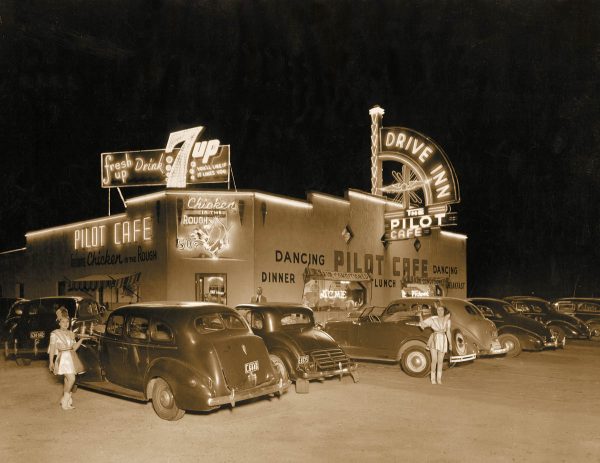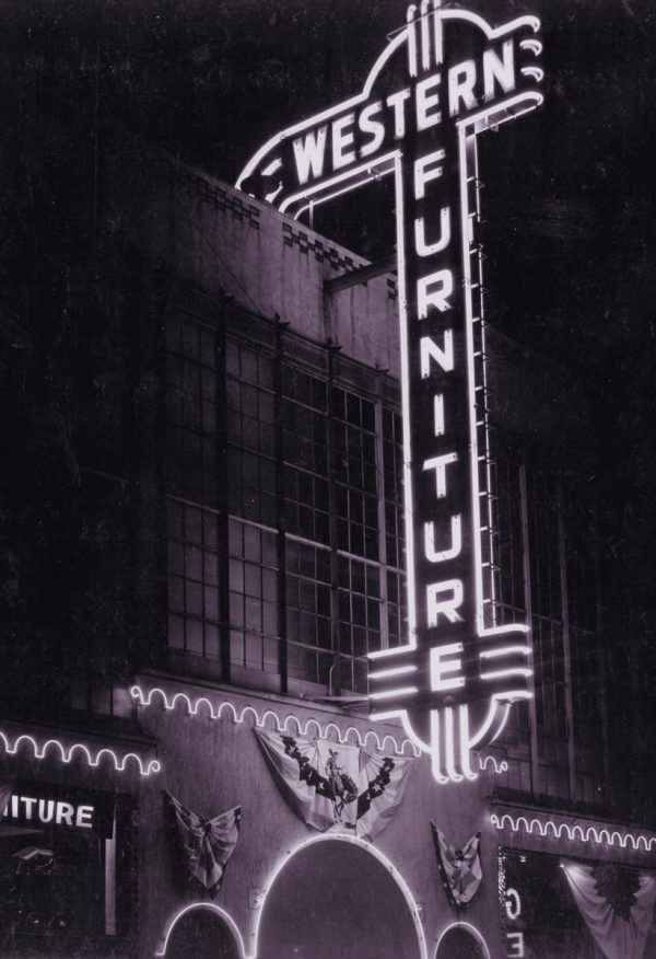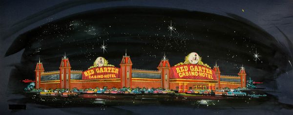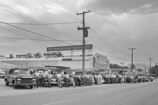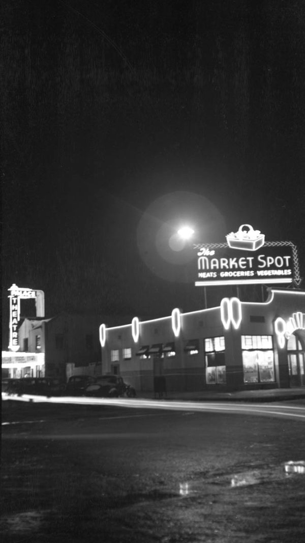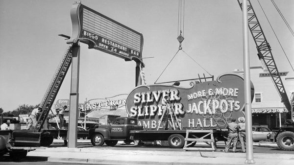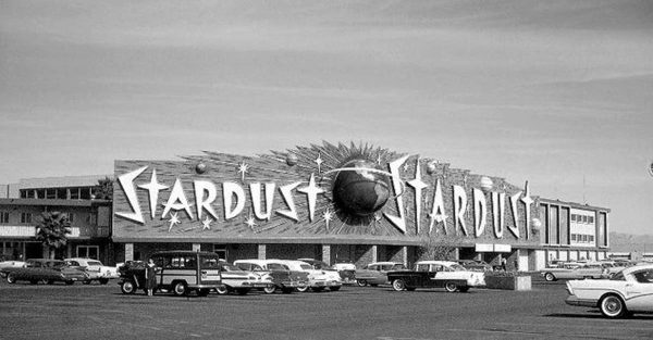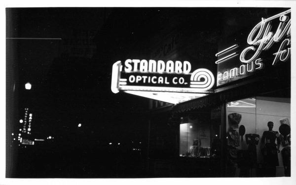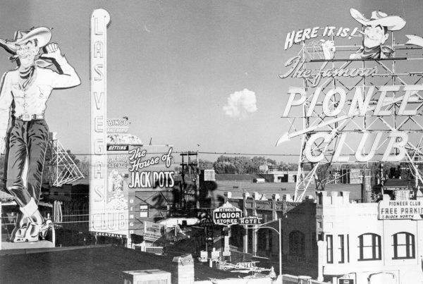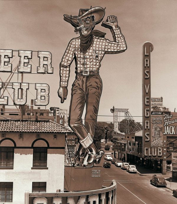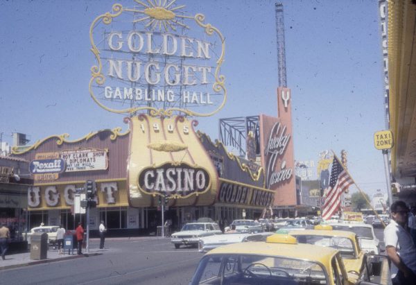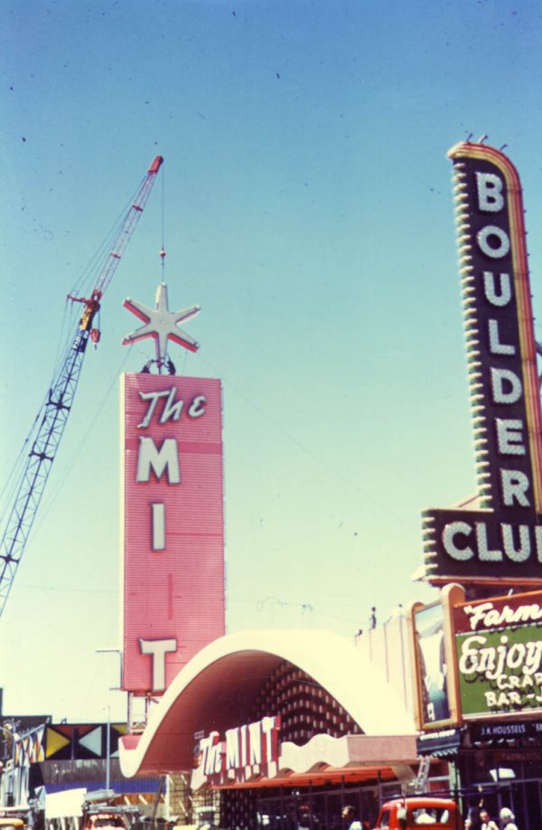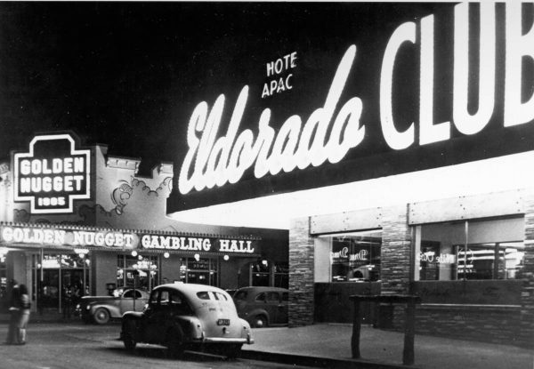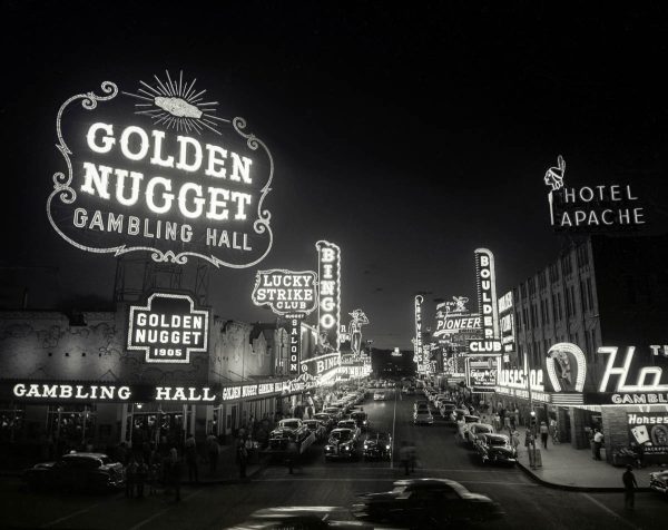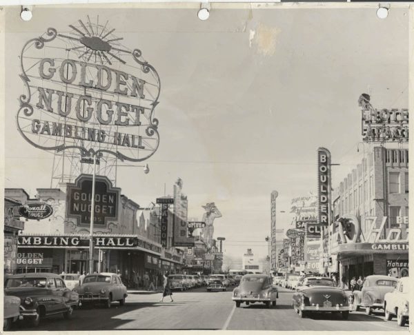Fremont Street at night with the Golden Nugget, Hotel Apache, Horseshoe, Lucky Strike Club, Pioneer Club, Boulder Club, and Las Vegas Club are visible in Las Vegas, Nevada. August 10,1954. CREDIT: Las Vegas News Bureau.